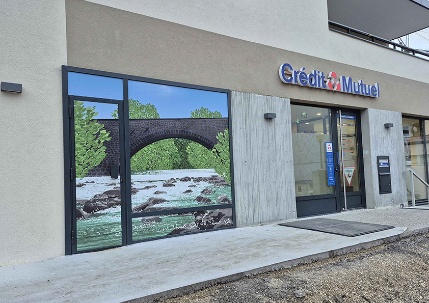 J’ai eu le plaisir de réaliser une illustration sur mesure pour la façade de l’agence Crédit Mutuel de Frangy, en Haute-Savoie.